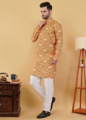 Step into elegance with this cotton printed kurta for men featuring Bandhani-inspired designs and delicate sequence work. Comfortable, breathable, and stylish—perfect for weddings, festivals, parties, and casual gatherings.