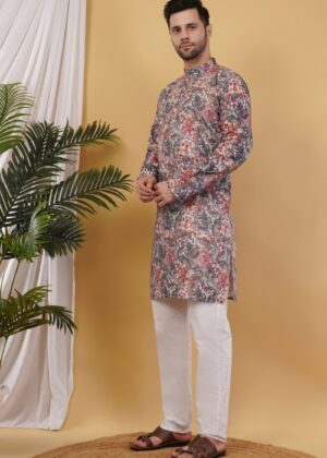 Cotton floral printed kurta for men with subtle sequence detailing. Lightweight, breathable, and perfect for weddings, festivals, and special occasions.