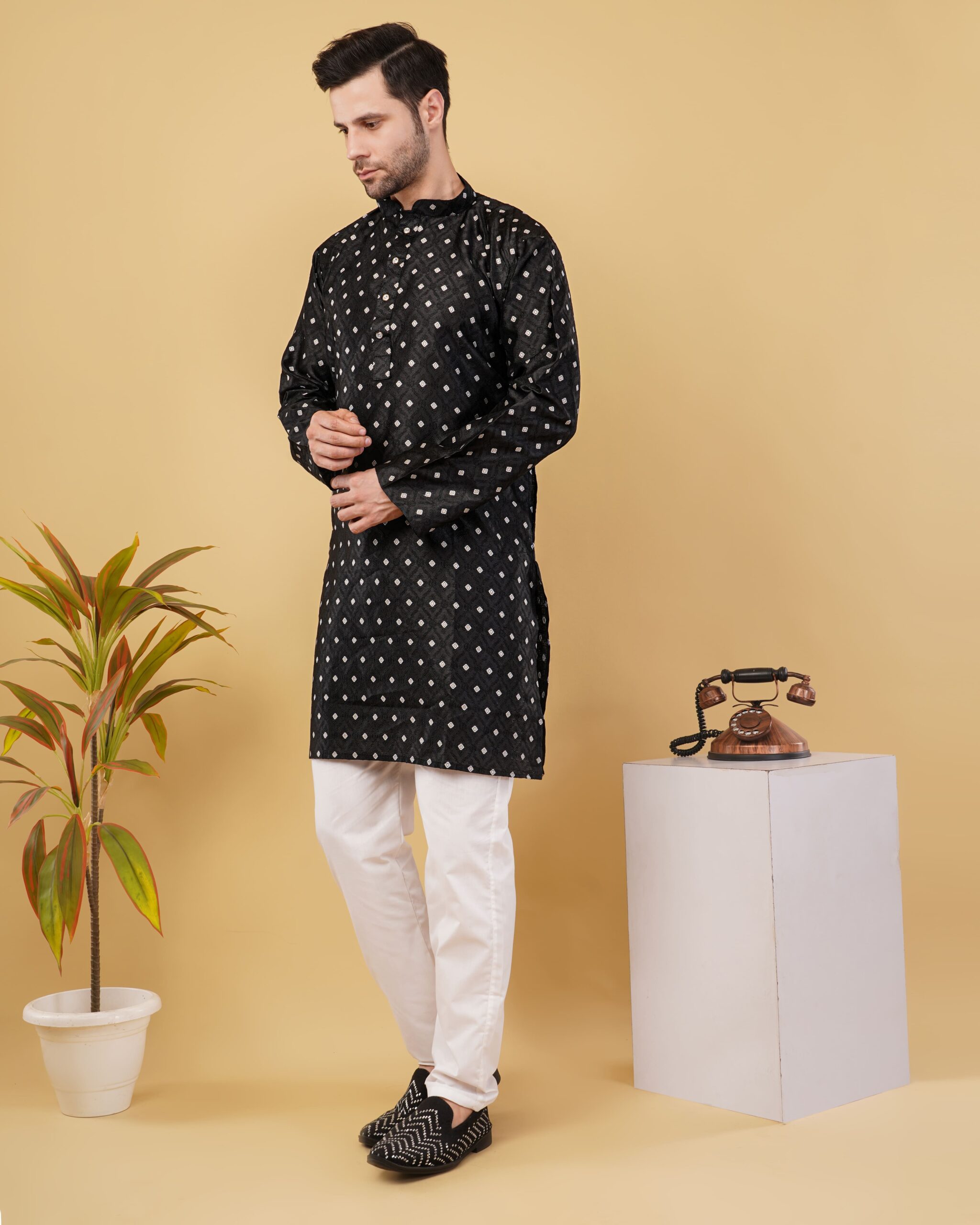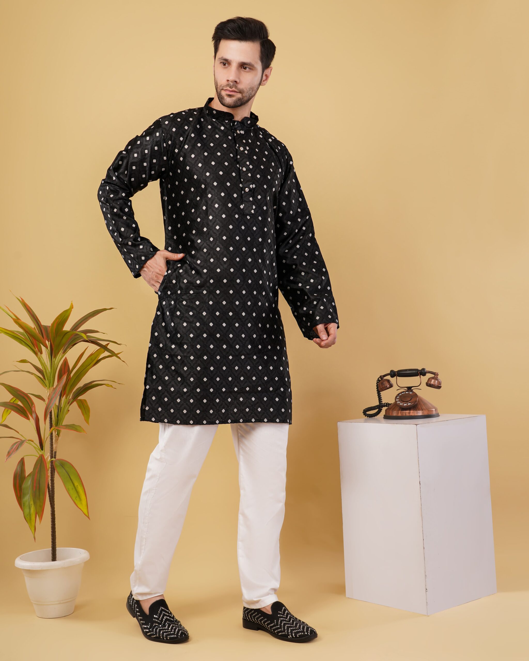 Step into elegance with this silk jacquard embroidered kurta, crafted for men who value sophistication with comfort. Made from a luxurious silk blend, this kurta showcases a refined jacquard weave complemented by intricate embroidery, making it a standout piece for festive and formal occasions.