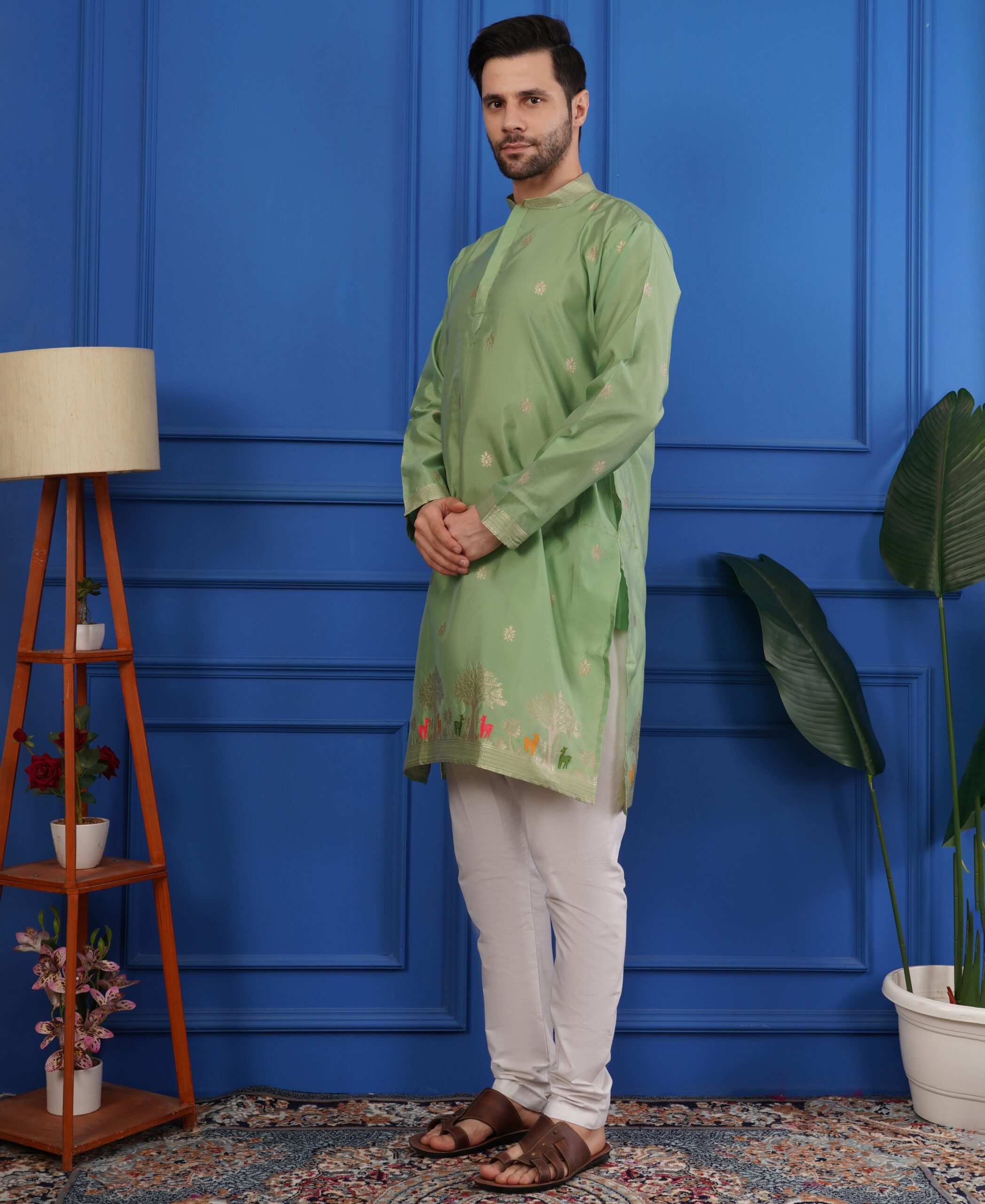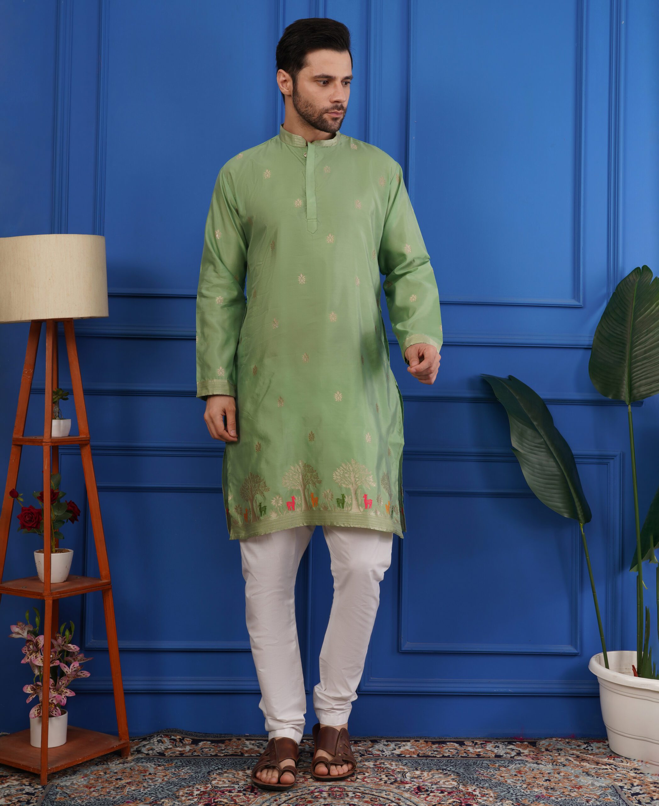 Step into elegance with this silk jacquard embroidered kurta, crafted for men who value sophistication with comfort. Made from a luxurious silk blend, this kurta showcases a refined jacquard weave complemented by intricate embroidery, making it a standout piece for festive and formal occasions.