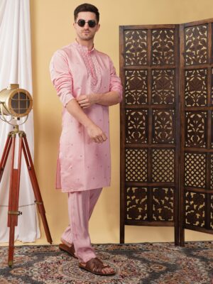 Enhance your festive look with this silk jacquard embroidered Indo Western kurta. Designed with a luxurious jacquard weave and fine embroidery, it’s the perfect choice for weddings, parties, cultural events, and festive celebrations.