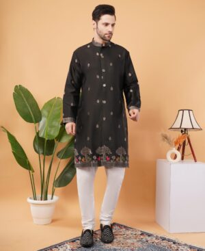 Men’s Silk Jacquard Embroidered Semi Indo-Western Kurta – Elegant Ethnic Wear for Weddings & Parties – Black